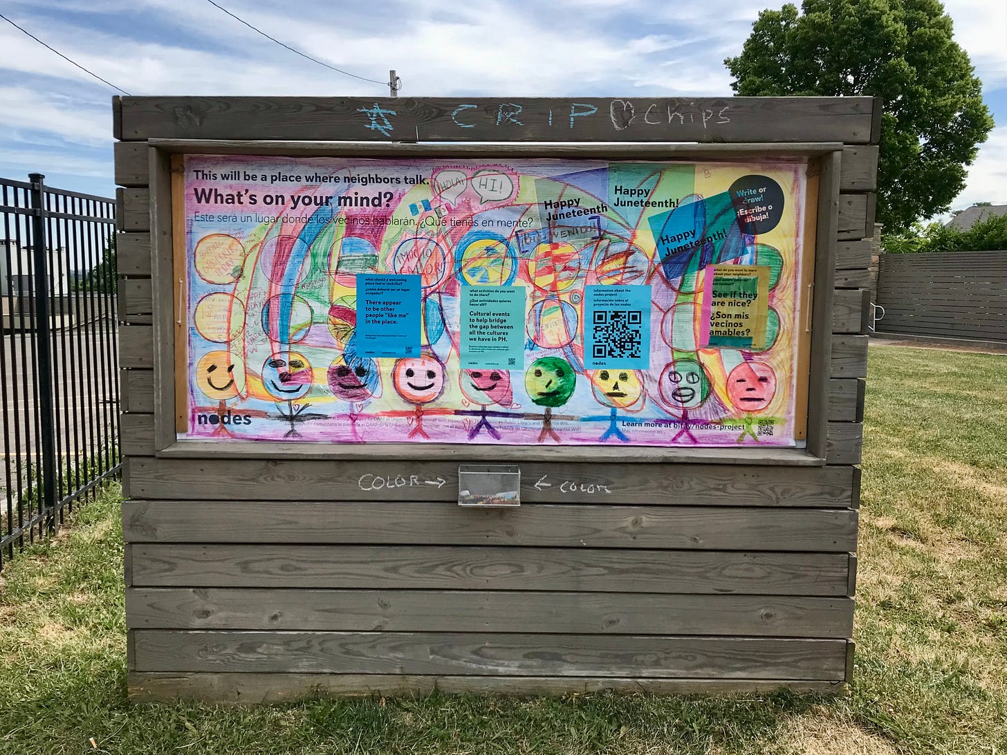 My teammate and I also displayed several prompts on the bulletin board (pictured above), asking the community to express their needs and desires for the area around the node. We exhibited the responses on the nodes website, print materials, and social media to amplify the community’s voices and encourage more participation. The combination of prompt activities and immersion in the space — with no definitive research goal — was crucial in forging a sense of connection between the community and the nodes team.